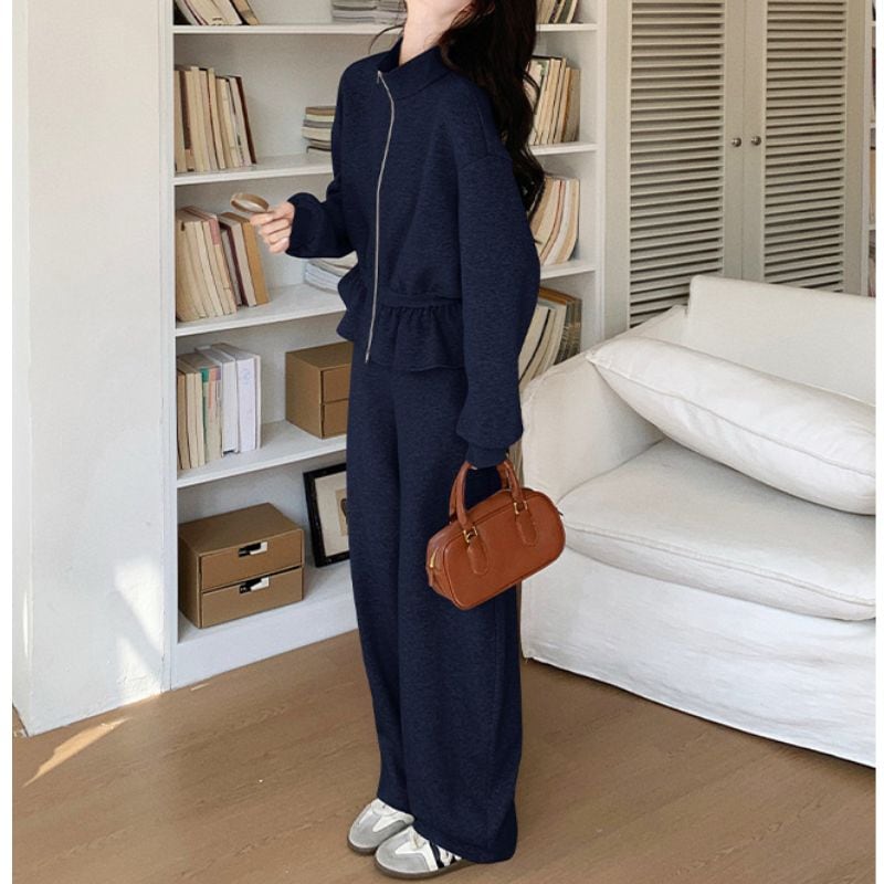 Stand collar peplum sweat & pants setup A1439