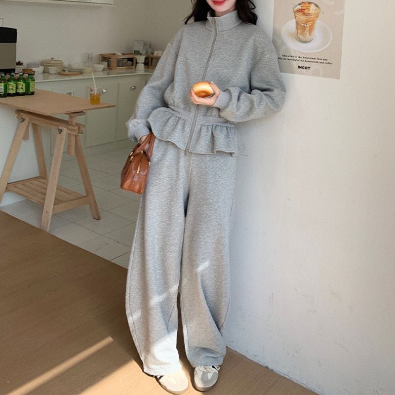 Stand collar peplum sweat & pants setup