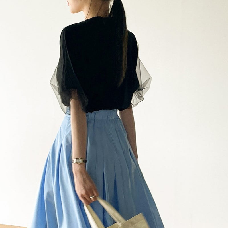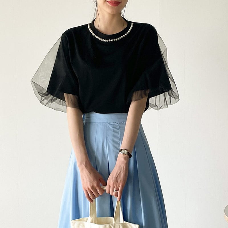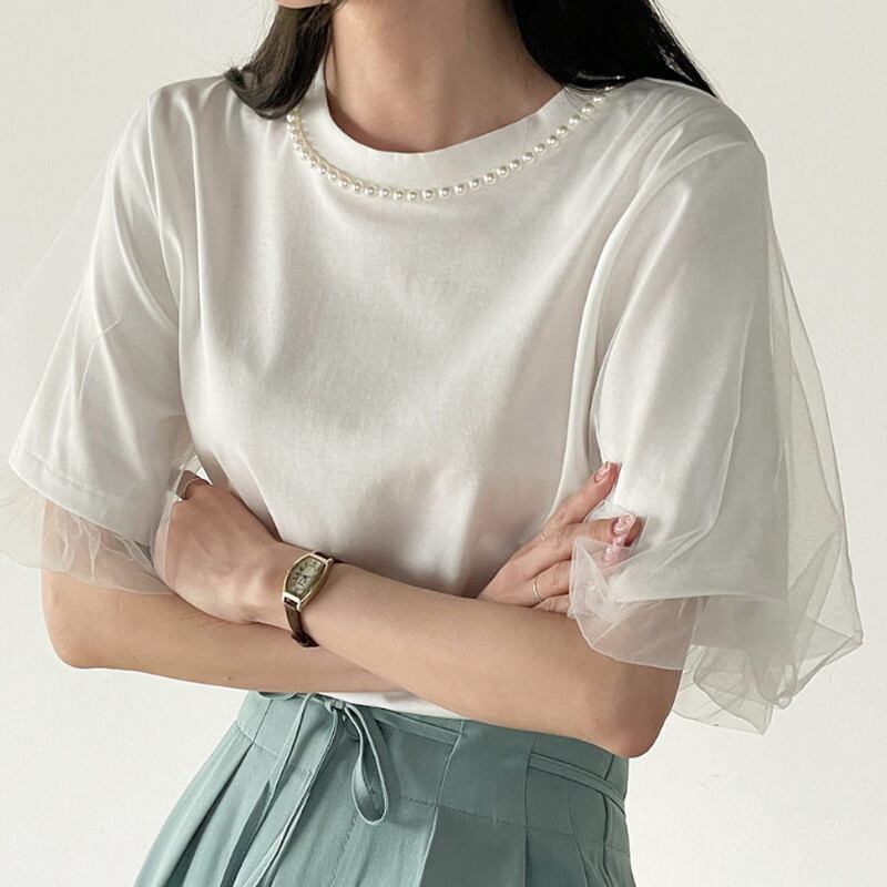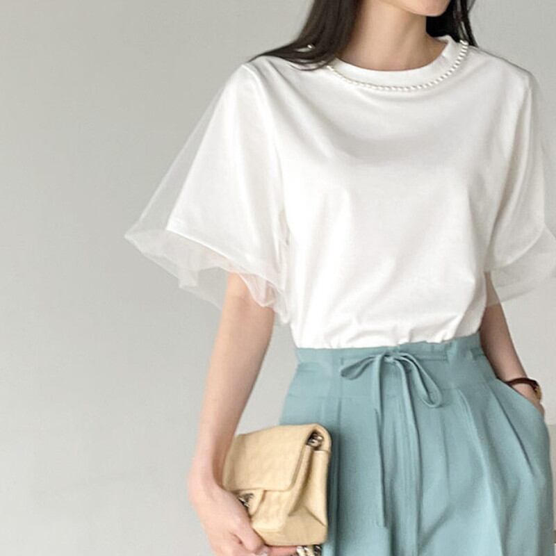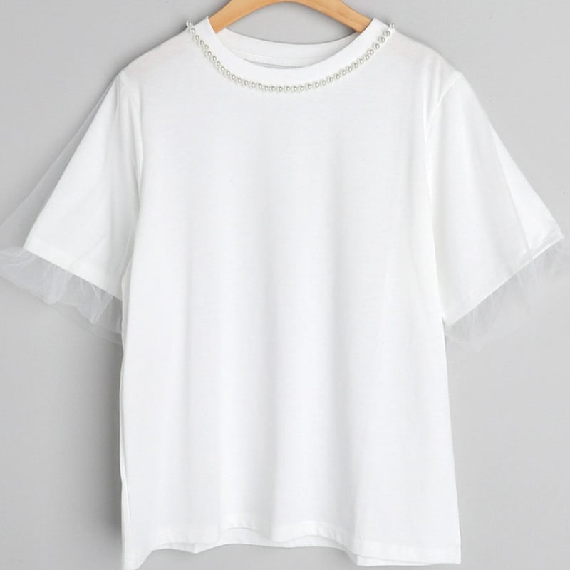 【即納ホワイト1点入荷!】Pearl line neck sheer sleeve T-shirt A1062