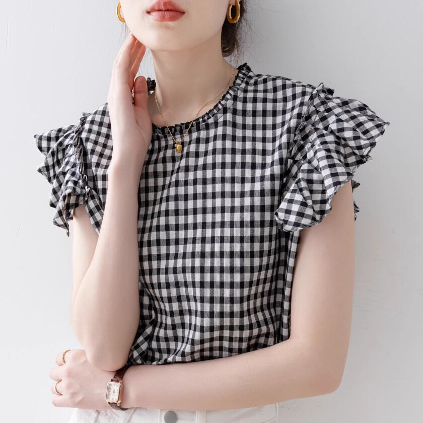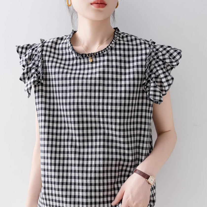 Flying sleeve gingham check pullover A1538