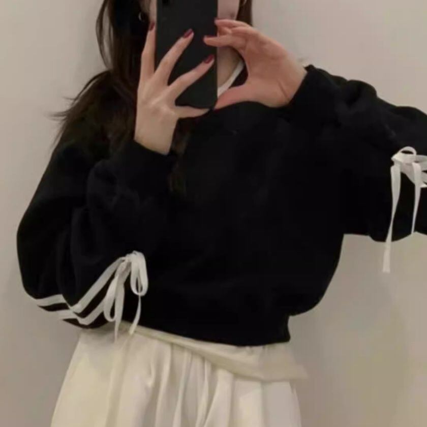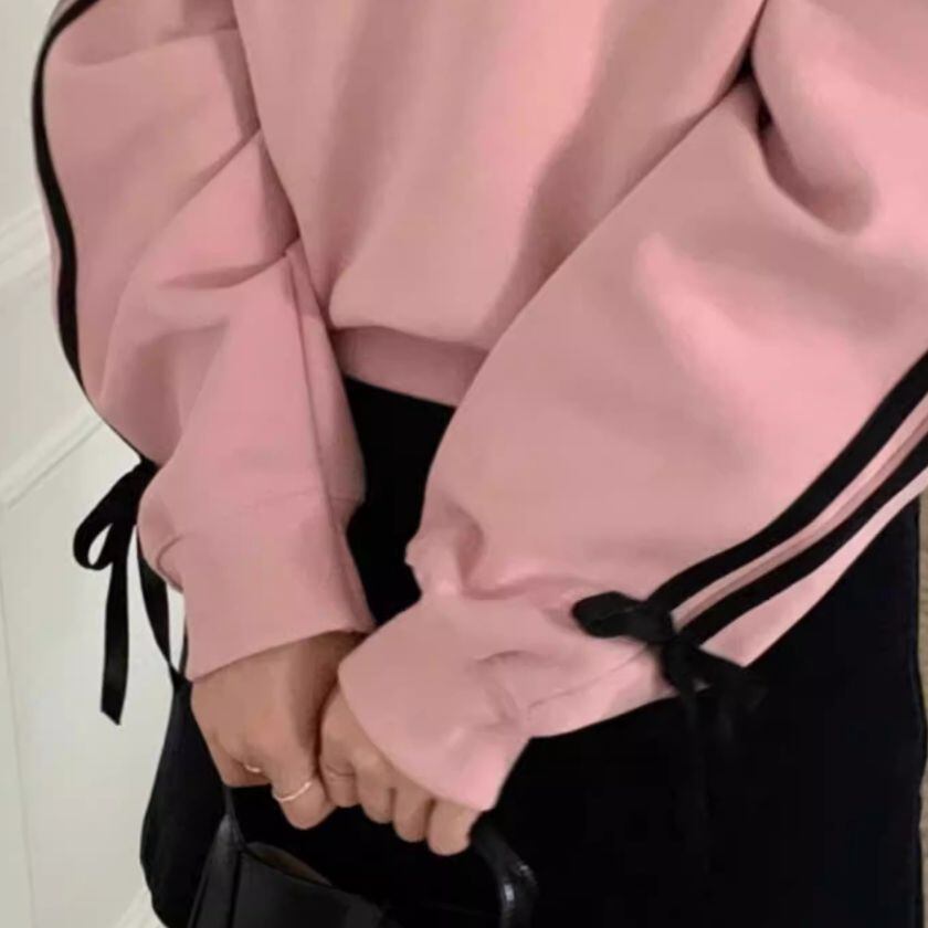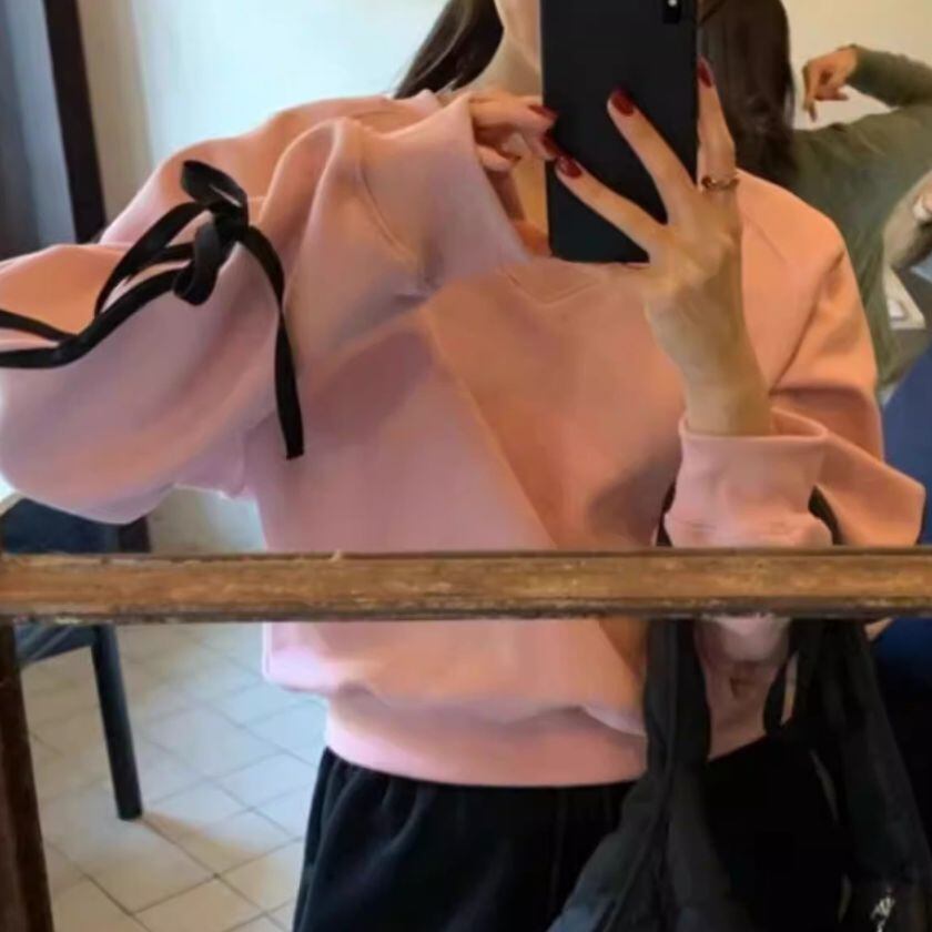 Ribbon sleeve V-neck sweat