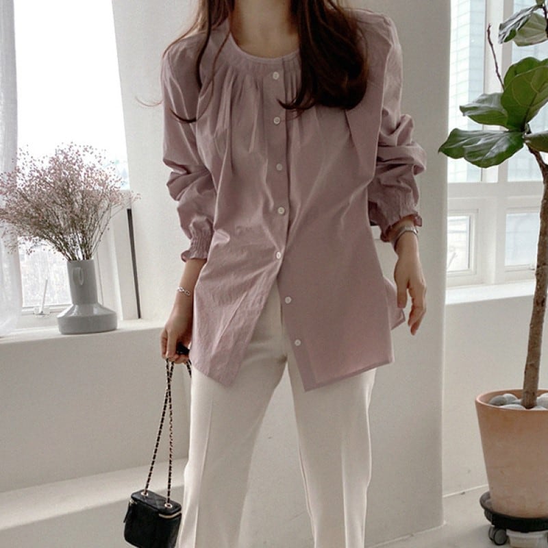 Frill cuffs collarless romantic blouse A067