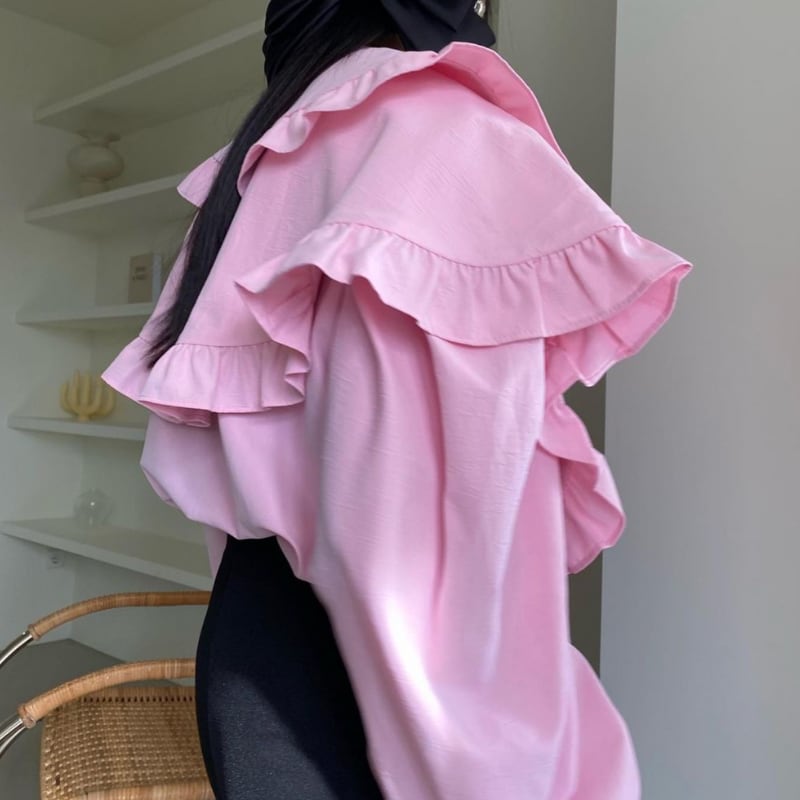フリルたっぷりのボリュームのあるデザインブラウス。
